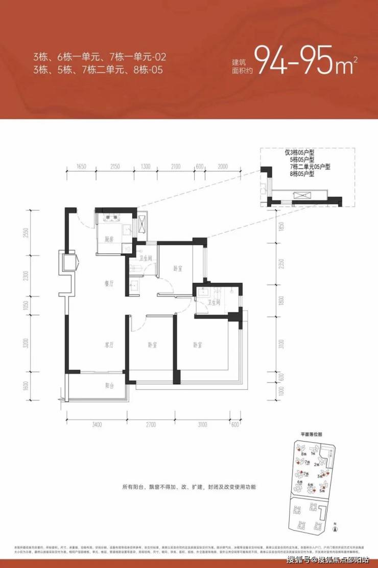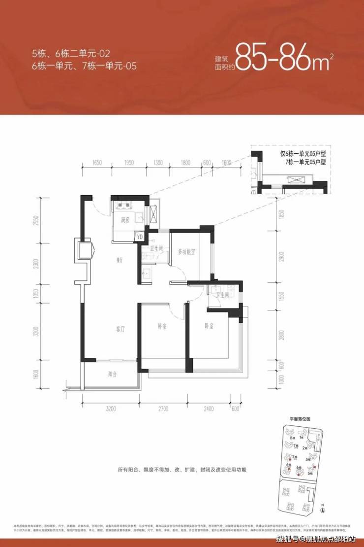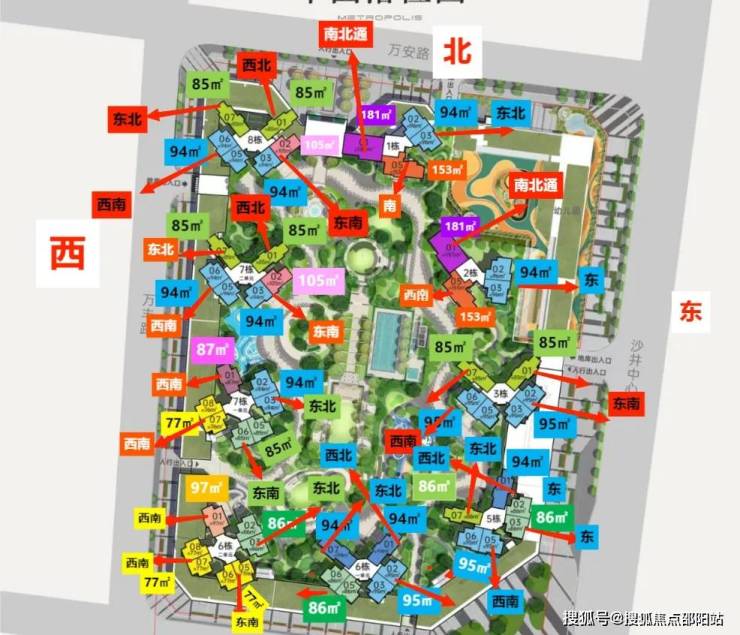 ①户型分析:小面积、低总价,最佳上车首选户型;全南向排布户型,多飘窗的设计,采光通风不错;户型方正,动静分区的设计注重隐私性;明厨明卫,三分离洗手间设计;②朝向:西南、东南向③视野:小区外围,临万丰路,看城市风景,施工建设区域【约85㎡三房两卫】户型分布:分布在7栋2单元、8栋、3栋,共710套,①户型分析:有横厅和竖厅两种户型,全屋7个飘窗、13米采光面,非常通透;预留超多收纳空间主卧双面采光,景观视野更开阔②朝向:东北、西北朝向③视野:社区花园和社区楼栋