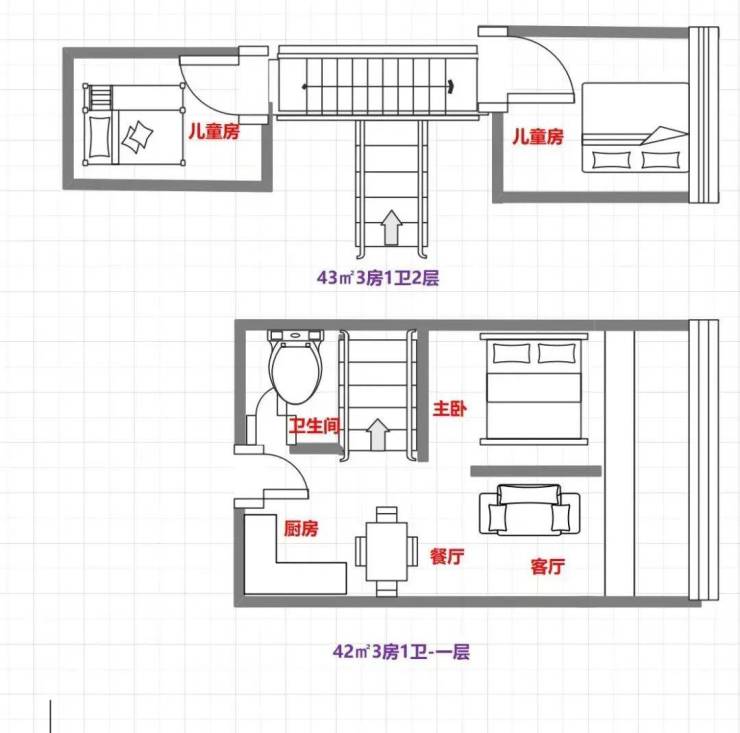 42㎡3房1卫户型图