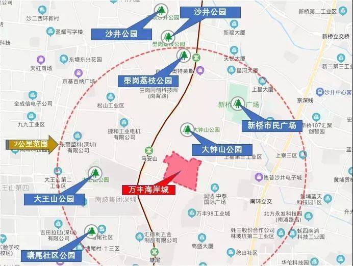整个万丰海岸城商业建面约143880㎡,建成后将会成为片区内规模可观的商业中心。1.3公里内还有万新商业广场(238米)、天虹商场(1.1公里)、形色城购物中心(1.4公里)。稍远点还有西荟城购物广场(2.3公里)、京基百纳广场(2.4公里)。几百米外的博林君瑞自带2.1万㎡商业。