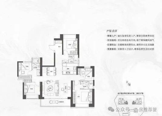 【139㎡的4房2厅2卫】1栋03/2栋02高区户型,电梯入户送独立公区,竖厅类双龙抱珠格局,四开间朝南,主卧大套间设计,有1个多功能间可以做书房,6.4米长观景大阳台,L型厨房带1个生活阳台,卫生间干湿分离,得房率:72.07%(不含赠送),西南朝向;