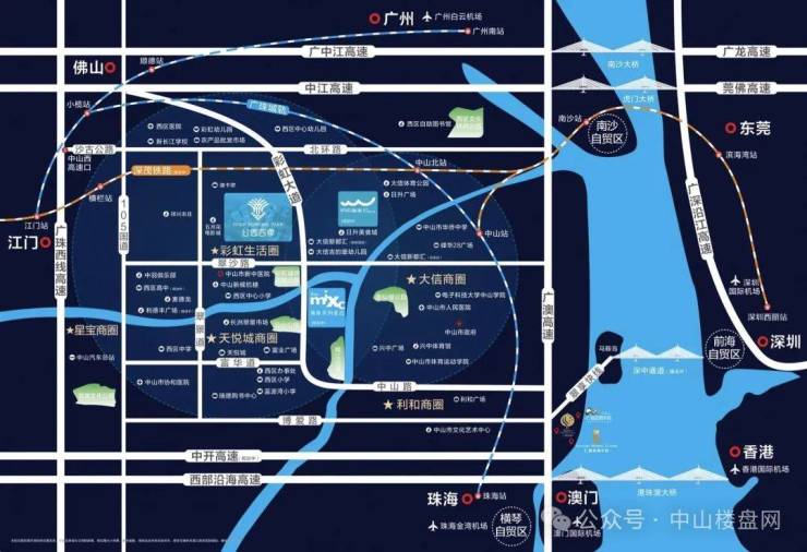 【城市枢纽】出门即彩虹大道,畅行主城圈;城轨2号线(规划)西起小榄,东至马鞍岛,途径西区、石岐、东区等;广珠西线高速从项目出发可迅速抵达中山西区与东升高速入口。