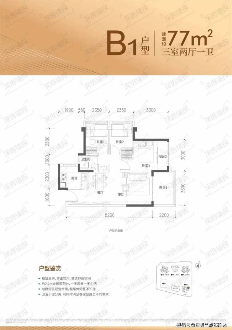 77㎡的3房2厅1卫,设计的是竖厅格局,客厅3.3米开间,进深8.2米,LDKB一体化设计,3个卧室分别做到了主卧11.3㎡/次卧7.28㎡/次卧7.28㎡(包含墙体飘窗),U型厨房,卫生间三段式分离,得房率约88.31%(包含赠送),东南朝向。