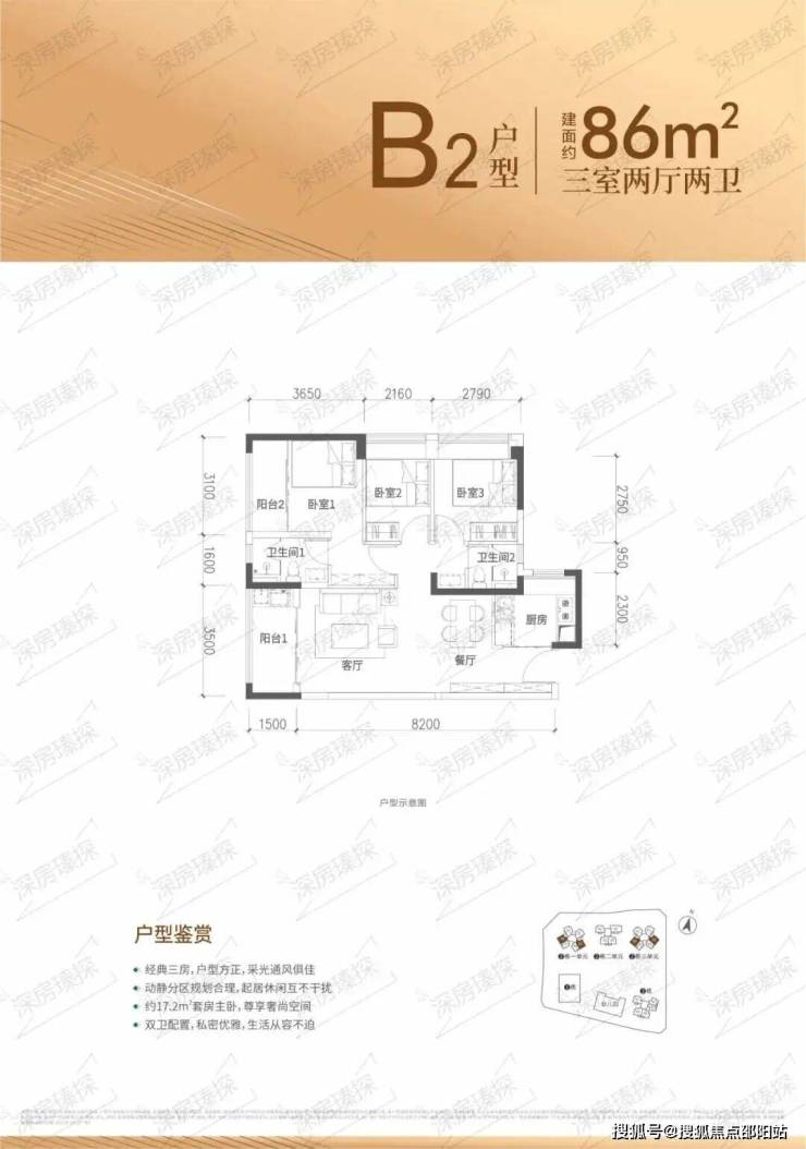 86㎡的3房2厅2卫,设计的是竖厅格局,客厅3.5米开间,进深8.2米,LDKB一体化设计,三开间朝南,3个卧室分别做到了主卧13.59㎡/次卧7.95㎡/次卧6.06㎡(实测面积,去掉墙体飘窗),U型厨房,公卫三段式分离,得房率约88.08%(包含赠送),东南或西南朝向。
