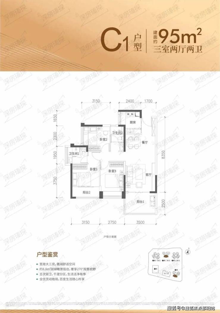 95㎡的3房2厅2卫,设计的是经典竖厅格局,客厅3.5米开间,进深8.35米,LDKB一体化设计,三开间朝南,3个卧室分别做到了主卧13.8㎡/次卧10.31㎡/次卧9.13㎡(包含墙体飘窗),U型厨房,公卫三段式分离,得房率约90%(包含赠送),西南或正南朝向。