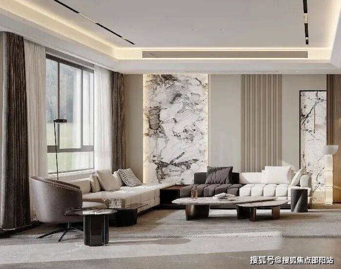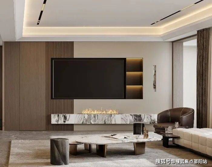 客厅米色L型沙发围合出家的氛围,大理石茶几与灰色地毯奠定温润的基底。一抹棕调单人椅静候一隅,让空间的对话有了起伏的韵律。电视墙与壁炉并置,将现代科技感与家中温暖氛围联结。嵌入式光线如自然天光般漫射,透过素色窗帘,与窗外的绿意一同生长进来。