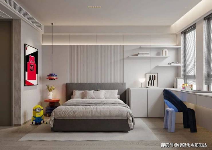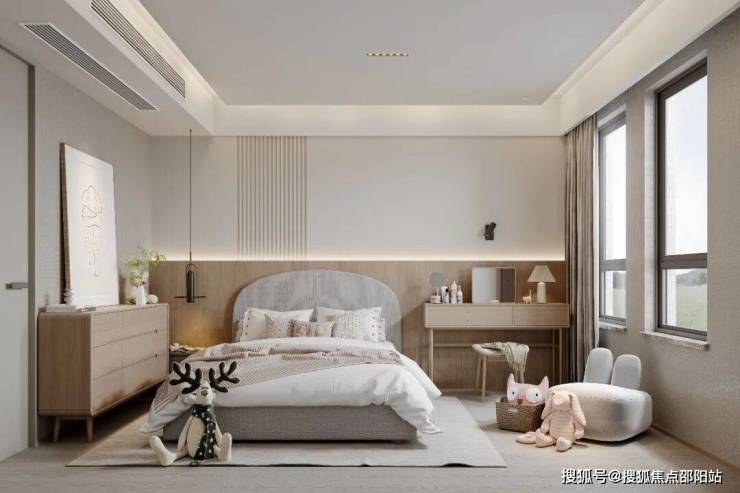 主卧如静泊的港湾,岛屿般的大床、柔和的灯光与触手可及的闲适角落,为日常提供安稳的靠岸。男孩房里,卡通模型悄然陈列,书桌临窗,仿佛装下了整个世界的探索欲;女孩房则被毛绒伙伴与柔和色调包裹,小梳妆台映照着细腻的成长心事。三个房间,以现代笔触铺开同一种温暖基底,守护每份睡眠,也默默尊重着每一个不同的梦。