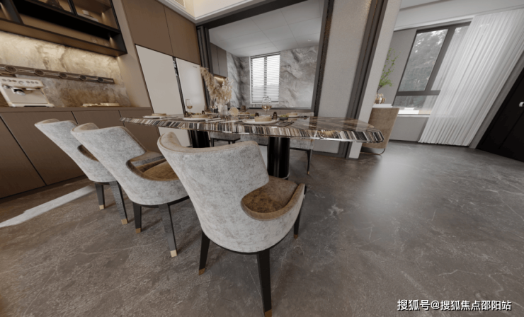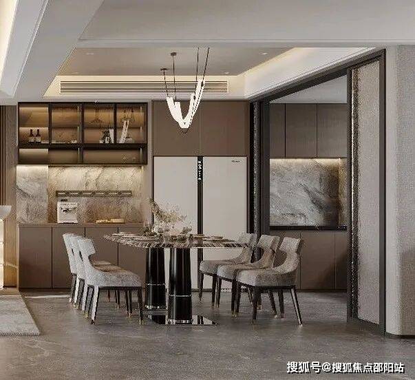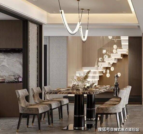 餐厅大理石纹理餐桌如静泊的岛屿,灰调大理石地面倒映着流畅的吊灯光影;高背座椅以妥帖的弧度承托身心。墙架上酒杯与艺术品轻语,空间在简约线条中展露温度。厨房器物隐于秩序之中,在这里,用餐成为一场细腻的沉浸。