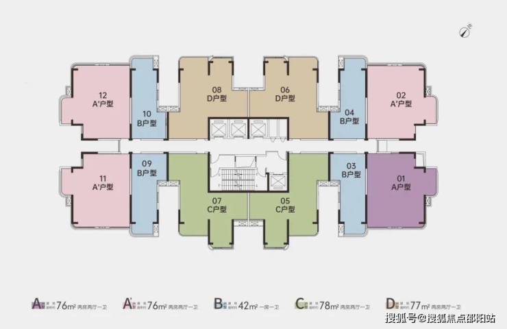 76㎡的2房2厅1卫(01.02.11.12户型),设计的是竖厅格局,客厅3.4米开间,LDKB一体化设计,2个卧室分别做到了2.7米/2.6米的宽度,阳台1.5米宽度,L型厨房,得房率:78.89%(不含赠送),有东北或西南朝向。