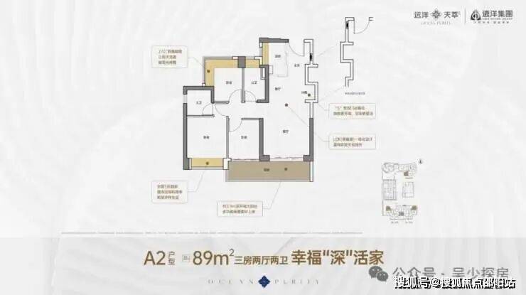 A2户型-约89㎡3房2厅2卫:户型分布在1、2、5单元,阳台南向、东向、西向均有选择。