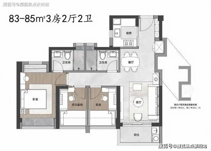 建面约83-85㎡3房2厅2卫,是项目的主力户型。对生活品质有更高追求的朋友,可以首选这个户型。