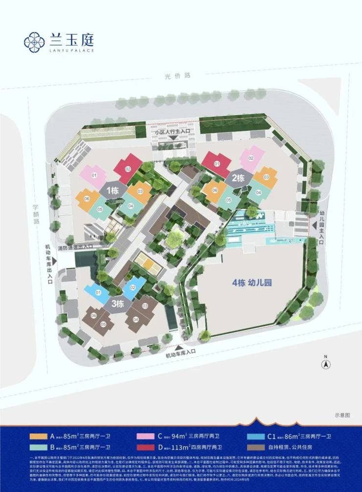 星辉兰玉庭,总占地面积约1.1万㎡,总建筑面积约8.4万㎡,容积率5,绿化率40%,共由3栋总高32-33F的住宅组成,另外规划1所九班制幼儿园,全部3梯6户,总规划558套,其中可售商品房434户,公共住房73户,自持租赁住房51户,停车位752个,车位占比1:1.35。