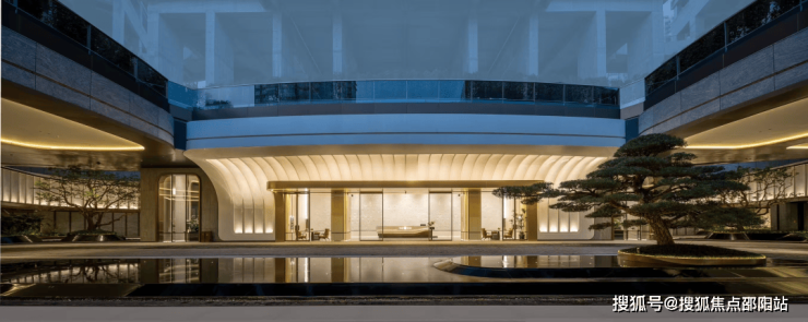 入户大堂的门头,以流线型圆弧曲面巧妙构思,巧妙地驯化了冰冷感的落地玻璃。经过匠人细腻手工打磨,每一处都避免了直角的生硬切割。如此,在视觉呈现上,门头散发出流动之美、温润之质、细腻之光、优雅之韵,成功消融了建筑与人性之间的距离感。