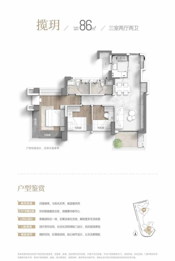 项目首开还是1、2栋,位于丰乐路和黄埔东路交界,1栋47层3T5,2栋31层2T5,分别有建面约86、95、115㎡三种全南向户型,使用率超100%。
