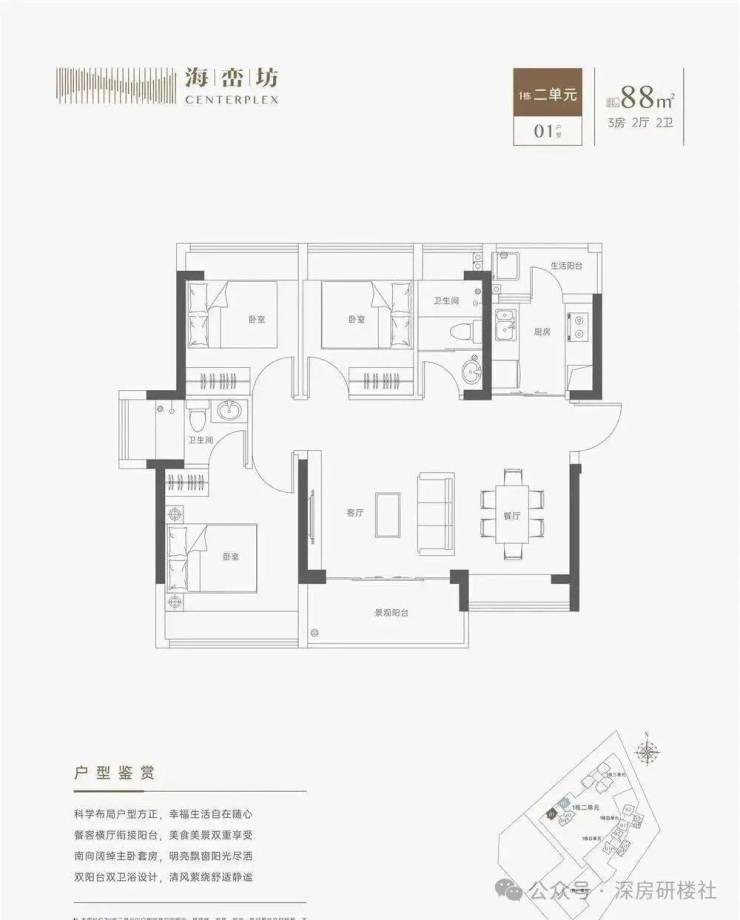 88㎡的3房厅2卫(1栋5单元01户型),设计的是竖厅南北通透格局,LDKB一体化设计,动静分区,四开间朝南,L型厨房,得房率:71.1%(不含赠送),阳台西北朝向。