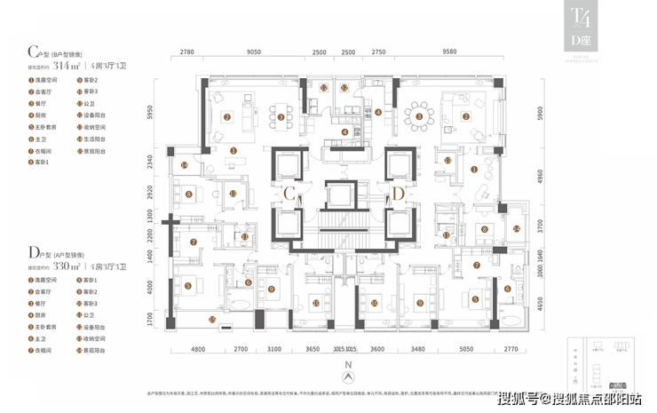 T4栋为314平和330平4房3厅3卫户型。330平户型动静分区,独立入户玄关。57平餐厨空间,奢华感十足。近60平主卧,空间阔绰,设有独立衣帽间。一次卧有景观阳台,景观视野好。314平户型将观景阳台设在主卧,主卧功能布局完备。两个户型餐、厨、客厅连成一线,动线合理。
