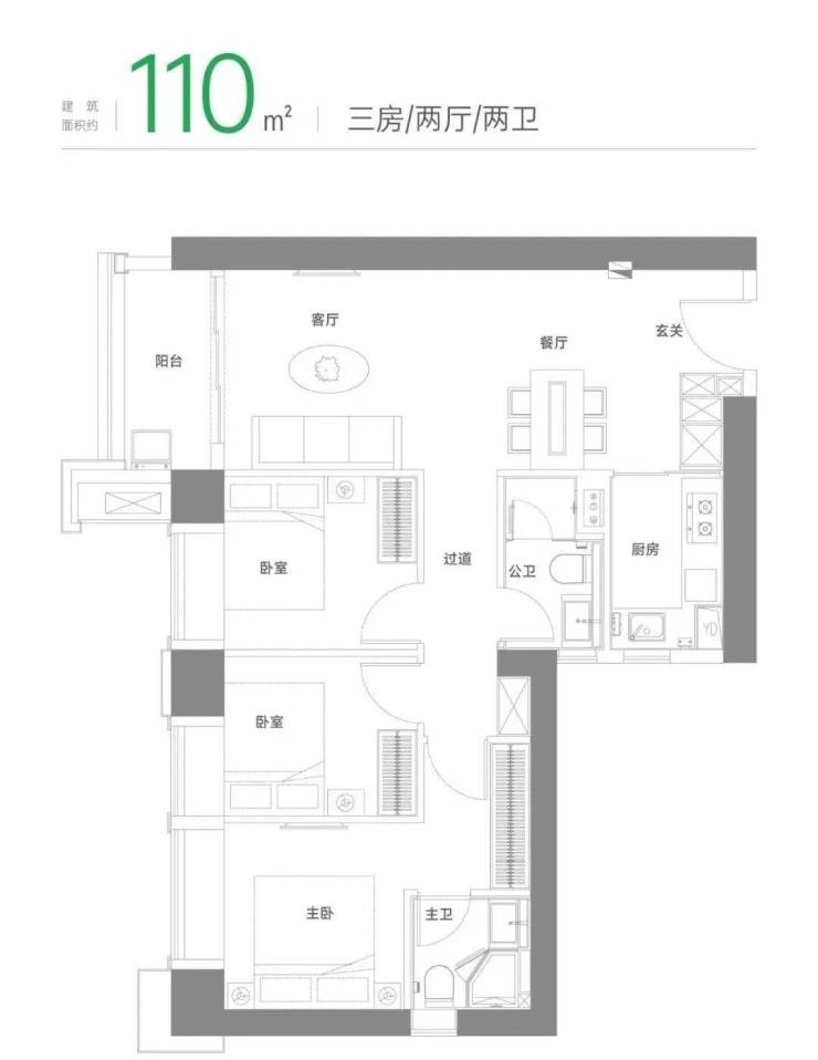110㎡三房:经典竖厅设计,动静分明,保障隐私。卧室标配飘窗,观景阳台展开风景画卷。餐客一体化设计,连通阳台,畅享全家欢聚时刻。主卧私享化设计,配备独立卫浴和衣帽间,为居民提供私密、舒适的居住体验。