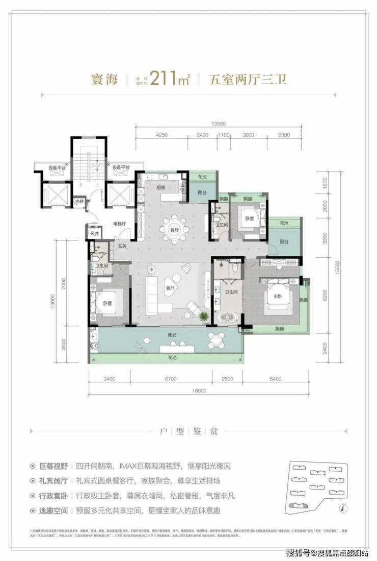 规划建筑面积约126-213㎡观海奢装大平层,约3.1米阔绰层高,部分户型创新设计270°全景飘窗主卧套、四开间朝南等,全成品高标奢装,营造全新舒居体验。