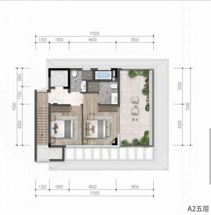 A2上叠建筑面积165㎡,3F2T4W,赠送约165平米(含地下车库65平米,4楼庭院面积83平米以及5楼阳台30平米,共4层(负一层车库+首层+4层+5层)客厅层高3.3米,卧室层高3.3米,地下车库挑高3.9米。(备注:数据仅供参考,具体以政府部门最终审定的图纸和销售合同为准。)