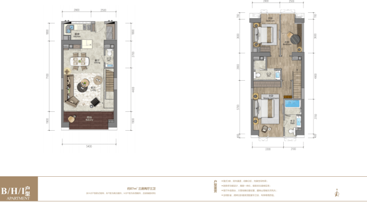 ★88㎡复式两房两厅三卫 双向通透采光,5.4米开间客厅及主卧,双套房周全设计,室内多变空间可根据家庭需要设置独特的功能。
