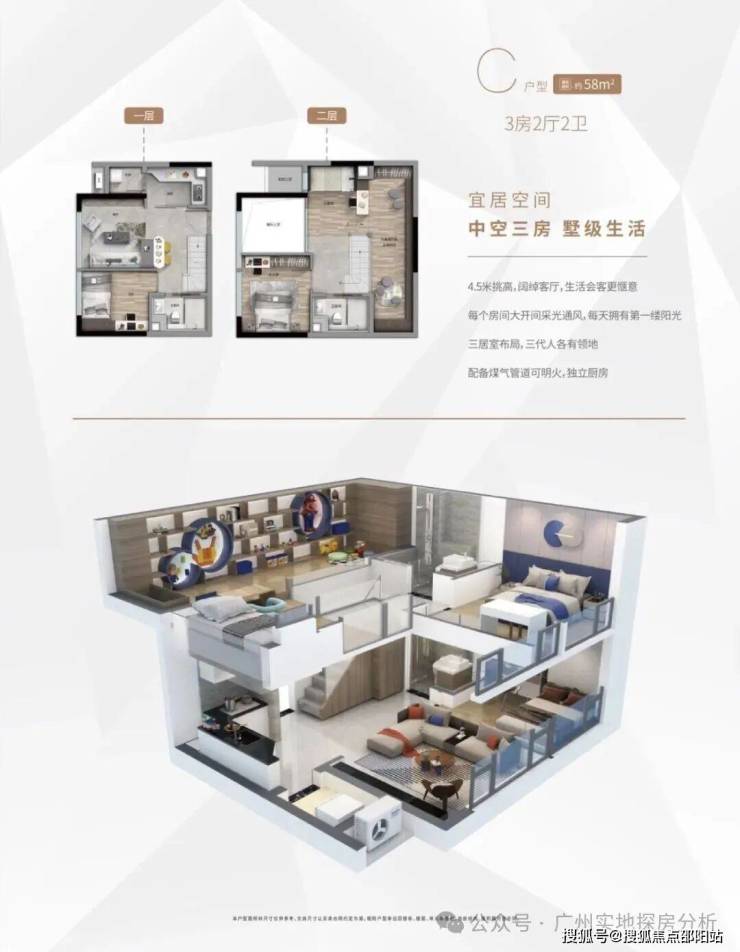 4.5米层高复式,部分户型可明火+带生活阳台(如58㎡三房);
