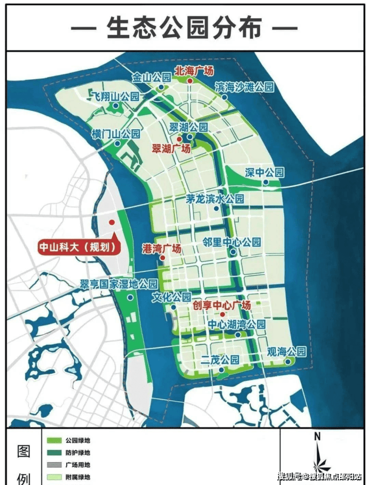 翠湖公园,翠亨国家湿地公园,深中公园,滨海沙滩公园,金山公园,飞鹅山公园,横门山公园,茅龙滨水公园,邻里中心公园,文化公园,中心湖湾公园,二茂公园,观海公园