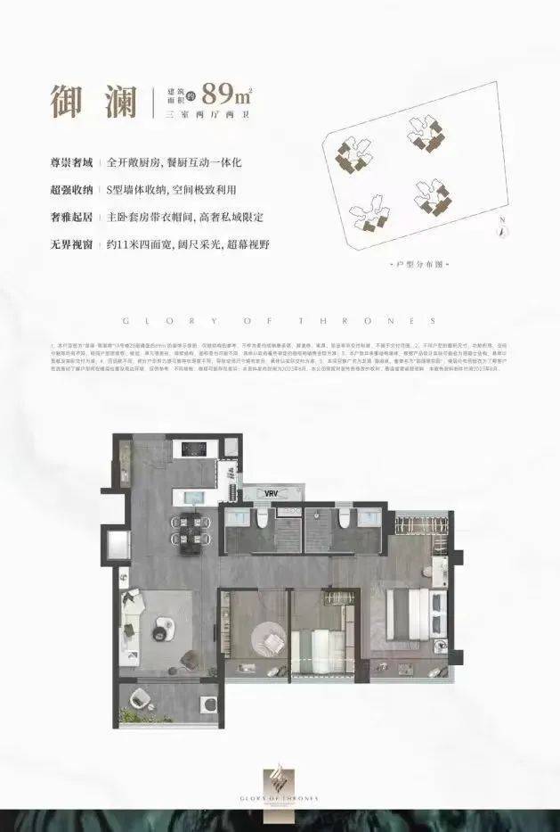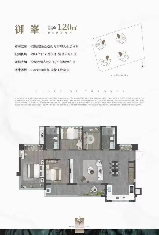 设计的是横厅南北通透格局,客餐厅开间8米,约14.7米超幕视野,超长阳台,主卧转角270°大飘窗,U型厨房,得房率:78.99%(不含赠送),阳台主朝西南或东南向。