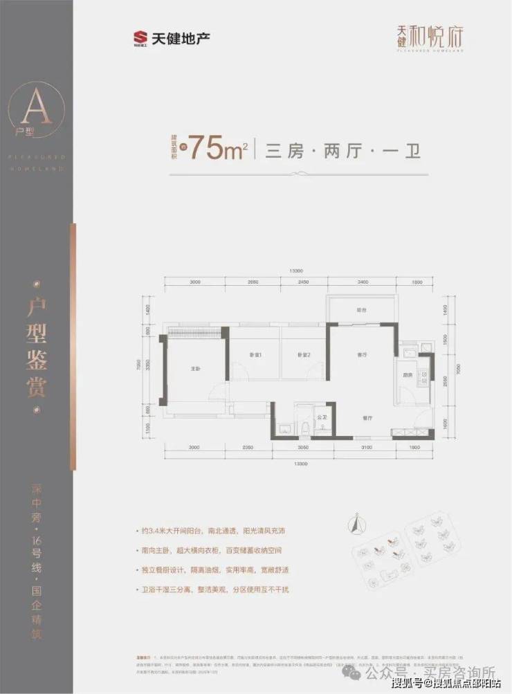 主推建面约75㎡通透三房两厅一卫75㎡的3房2厅1卫,设计的是竖厅南北通透格局,进门入户玄关,客厅实测3.18米开间,客餐厅实测约16.75㎡,分别做到了主卧13.08㎡/次卧6.41㎡/次卧5.66㎡(实测面积,去掉墙体),L型厨房,卫生间三段式分离,得房率81.3%(不含赠送),阳台4.29㎡西北或东北朝向。赠送面积约10㎡,加上赠送后得房率约94.62%。89㎡三房两厅两卫、99㎡三房两厅两卫住宅,最低首付仅需23万,即可实现最低门槛上车深中旁、地铁口装修三房,一步到位!送高配精装修!