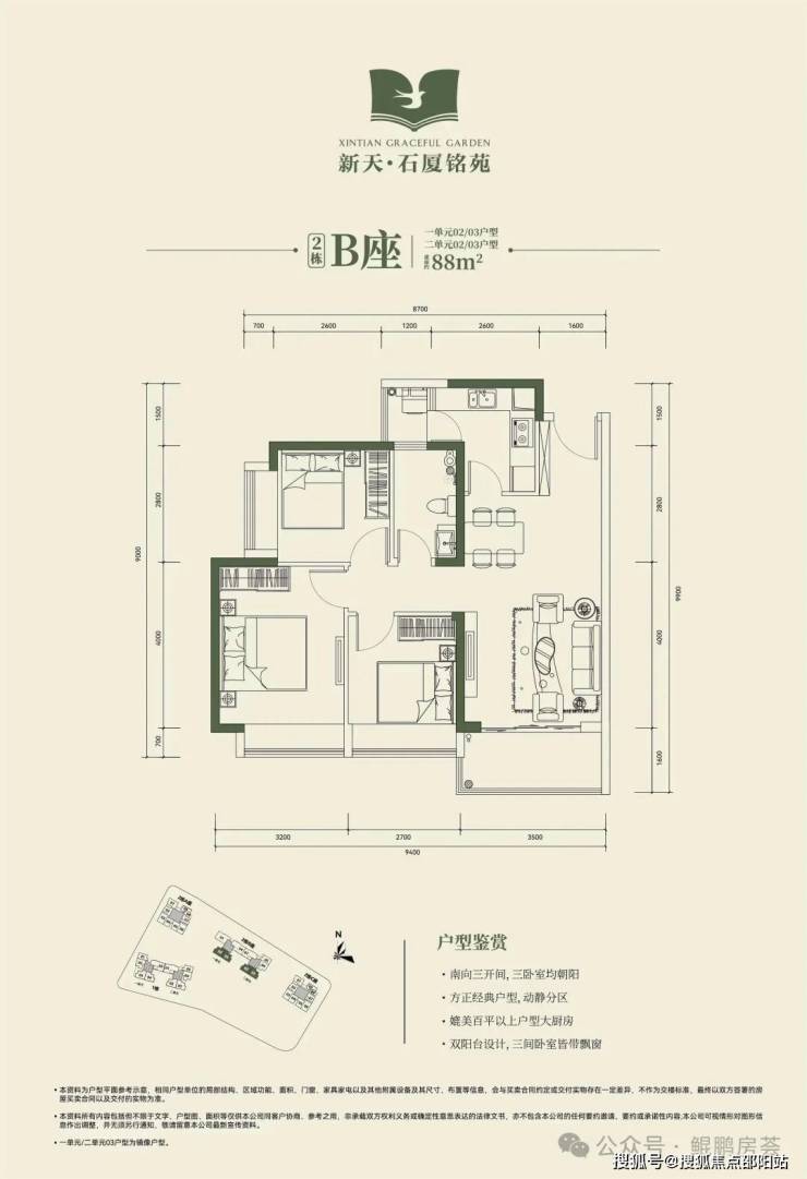🔸2栋B座一单元02、03户型、2栋B座二单元02、03户型:面积约为88㎡的3房2厅1卫;