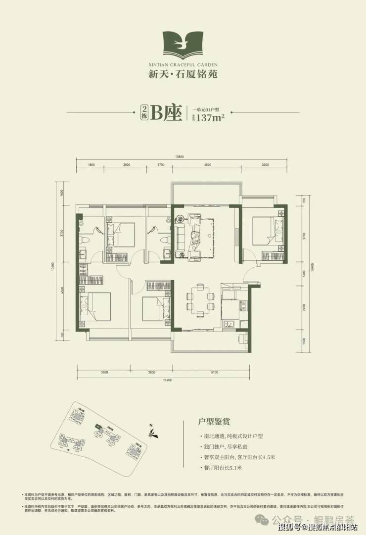 🔹2栋B座一单元01、04户型、2栋B座二单元01户型:面积约为137-138㎡的4房2厅2卫;