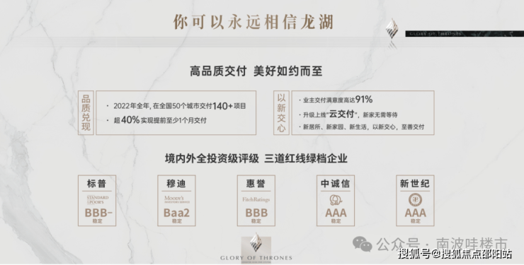 强交付力:全国项目100%如期交付,其中超40% 提前至少1个月交付,业主交付满意度91%