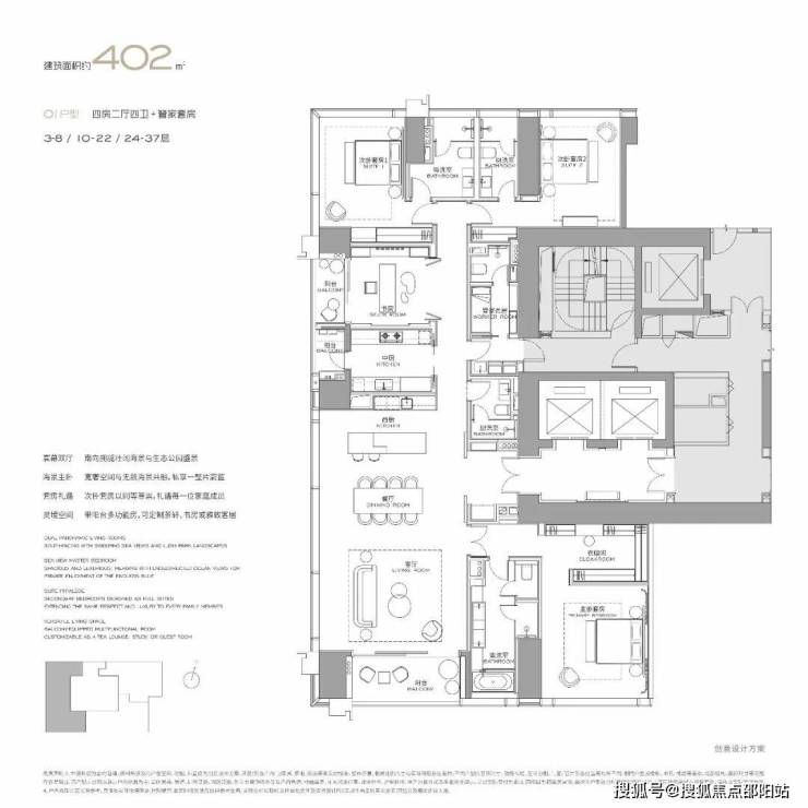 首批推出 303/327/400/570㎡大平层,均通燃气且配备超大阳台,部分户型采用 270° 环幕视野设计。