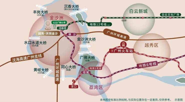 沉香大桥(规划)、广佛大桥(在建)、金沙洲大桥等与白云、荔湾便捷连接。其中,在建的广佛大桥、地铁12号线预计今年完工,明年开通(来源:广州白云发布,具体实际开通时间以官方公布为准)。