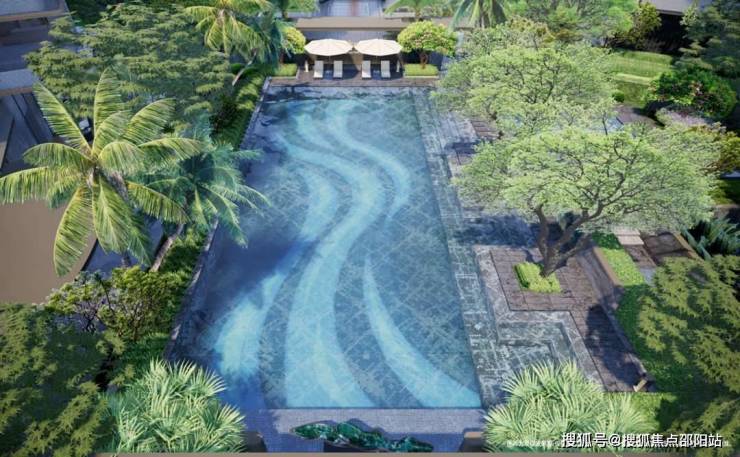 【繁星泳池】泳池入口设计了穿孔不锈钢雕塑,以三片水流捧着散落星光做出"繁星"造型,泳池池底定制繁星艺术瓷砖,拼贴成流动星河图案,同时配备水下星星灯、池壁灯,延展出无边际泳池的效果。