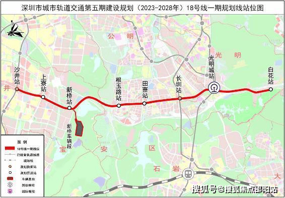 18号地铁线,这是一条东西向的地铁线路,规划串联宝安海洋新城、光明城、观澜、平湖金融城,全长61.6公里,设站27座,其中一期工程沙井站-白花站,设站8座,全部为地下站,设计时速120公里,