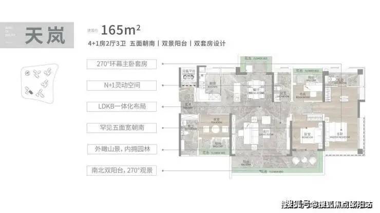 建面 165㎡4+1 房大平层:终极改善户型,双阳台南北对流,17.4 米南向面宽搭配近 9 米 L 型景观阳台,三面望山景;中式厨房 + 独立西式岛台满足多元烹饪需求,双主套设计适配三代同堂,主卧 270° 飘窗与独立卫浴尽显高端,适合追求品质生活的高净值家庭。