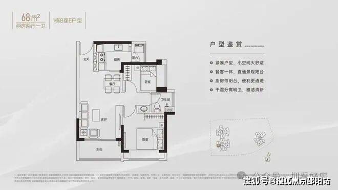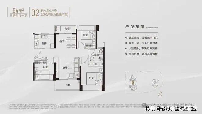 竖厅南北通透格局,客厅3.4米开间,客餐厅双阳台分离化设计,U型厨房,卫生间干湿分离,得房率约79%(不含赠送),客厅阳台主朝东北向。