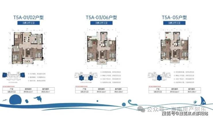 T5A户型:108㎡三房两厅两卫,南北通透,全明设计,配备双阳台,得房率超85%