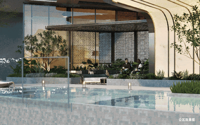 中建天钰主入口采用酒店式落客区设计,进入小区前,必须穿过拥有高透外立面的归家大堂,约9米的挑高,竖向尺度上便拉满了酒店迎宾感。