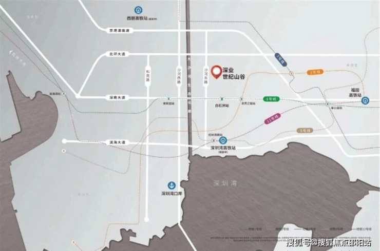 区位概况 项目位于深湾创新走廊核心位置,沙河街道明珠街社区。四大总部基地环绕——往北是留仙洞总部基地、西丽湖国际科教城,往西是深圳湾高新区总部基地、后海总部基地,往南是深圳湾超级总部基地,往东是华侨城、福田CBD。白石洲550万㎡旧改正在推进,将建设400米国际超甲级写字楼群+40万㎡旗舰商业。