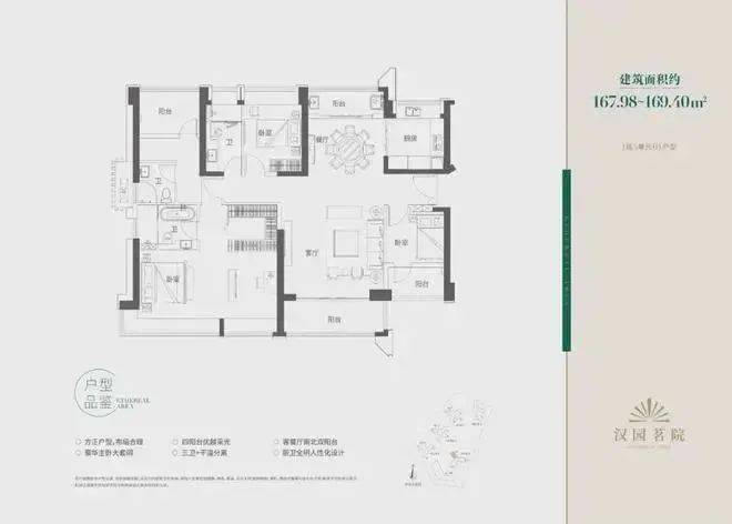 项目户型方正、布局合理,动静分区,其中168㎡五房户型为四阳台设计,客餐厅南北通透双阳台,豪华主卧大套房。