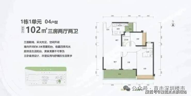 102㎡的3房2厅2卫,1栋1单元02户型,设计的是经典竖厅格局,进门入户玄关,客厅3.5米开间,LDKB一体化设计,三开间朝南,动静分区,客厅连接次卧出6.3米长的巨幕大阳台,二字型厨房还带1个生活阳台,卫生间干湿分离,西南朝向。
