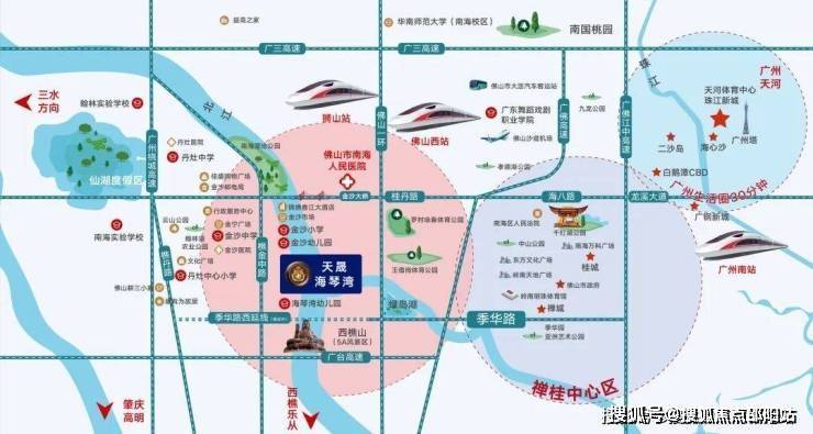 项目地处丹灶金沙核心区,紧邻桂丹路主干道,通过“四横六纵”的快速路网,仅需半小时即可通达广州和佛山。其中,“四横”包括广三高速、桂丹路(1个红绿灯直达千灯湖)、季华路西延线和广台高速;“六纵”则涵盖了广州绕城高速、樵丹路、樵金路、佛山一环、广佛高速和广佛江中高速。此外,随着季华路西延线的即将开通,从天晟·海琴湾到禅桂中心只需15分钟车程,进一步提升了出行的便捷性。