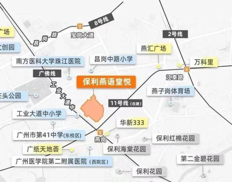 双地铁:燕岗站,1号线(广佛线)、11号大环线(建设中,预计今年通车)双地铁上盖,4站达上涌、8站达琶洲,轻松链接全城。