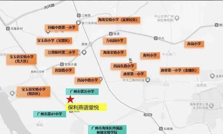 项目配建一所24班的小学,就在家门口,保利燕语堂悦的学校移交后将由教育局委托海珠区宝玉直实验小学领办,学校正式开办后,保利东方臻悦花园小区(保利燕语堂悅)符合“人户一致”条件的业主适龄子女可按地段申请入学,周边还有工业大道中小学、广州市第41中学、广州市第5中学、广州昌岗中路小学(翠城校区)、广州市海珠外国语实验中学附属学校、红棉小学(顺意小区)、海富小学、南燕小学、宝玉直小学(南边路校区)