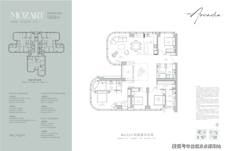 建面约252㎡户型是四居室+灵动空间+三卫,客厅和主卧套房均打造约270°全景视野, 将周边景观资源直接引入室内,创造“有限空间见无限景观”的效果。