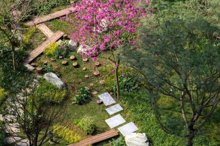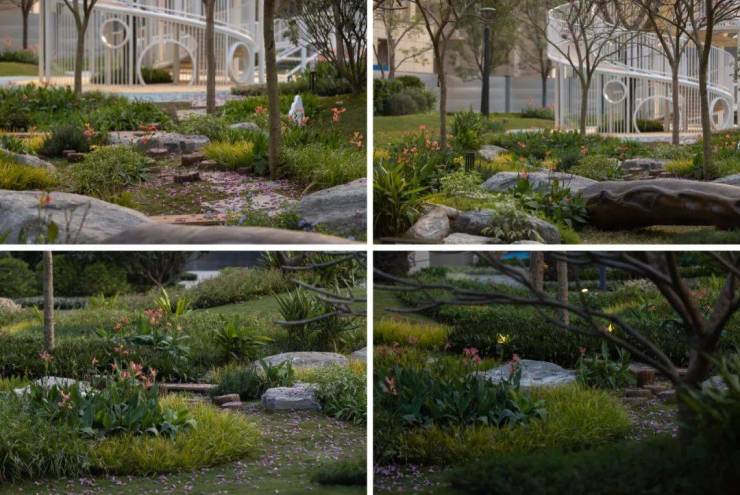 雨水花园打造自然草坡、生态旱溪、湿生植物、石板小路和游戏木桩等,解决了雨水收集问题、改善小气候,也为鸟类、动物和微生物提供生存环境,保证生物的多样性。可供休憩玩耍的雨水花园,激发了人们主动探索的兴趣,实现人与自然同生共长,为居住者带来前沿健康社区的居住享受。