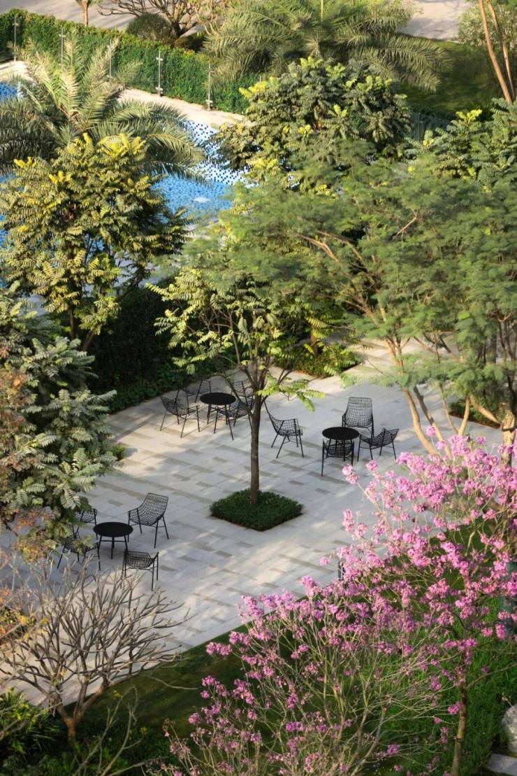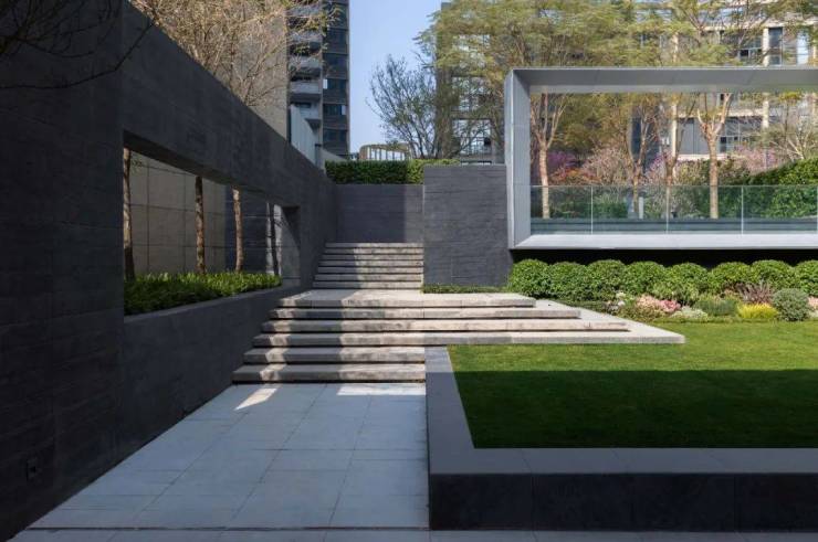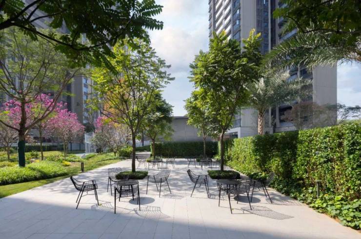 林荫树阵广场,选用有较高观赏价值和鲜明特色的高分枝乔木,一侧绿篱围合,创造符合人的心理需求的领域感和归属感。细致而有温度,赋予生活一种清逸滋味。