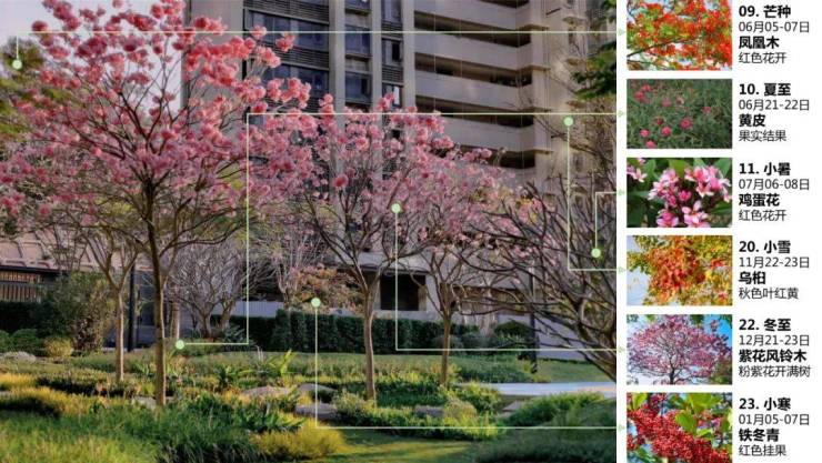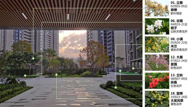绿荫漫园,花香四溢,启城家园的绿意,给居者一片私属都市桃源。种下四季流转的植物故事,落地二十四节气植物系统。植物的搭配充分考虑了颜色和质地的变化,结合园区不同场地的植物生境合理运用乡土植物,打造观花植物、观叶植物、旱溪植物、诗经植物、象形植物五大主题区,丰富的品种也为后期自然教育提供了合适的场所。