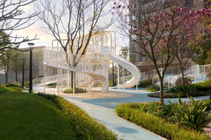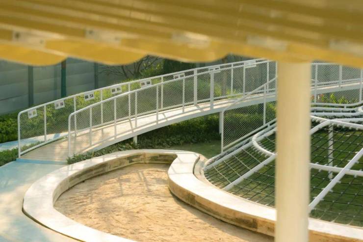 设计充分考虑与周围景观的互融互补,设置满足各个年龄段尺度及爱好的亲自然空间。绿心树屋、冒险爬网、亲子滑梯、沙坑寻宝、旱溪花境、植物科普、环抱看护等多样化的设施,集探险、创作、游戏和休憩于一体。在这里,孩子们可以游乐、玩耍、探知,享受童年的无忧无虑;也可以促进亲子互动,发掘孩子潜能,让孩子在嬉戏中快乐成长。