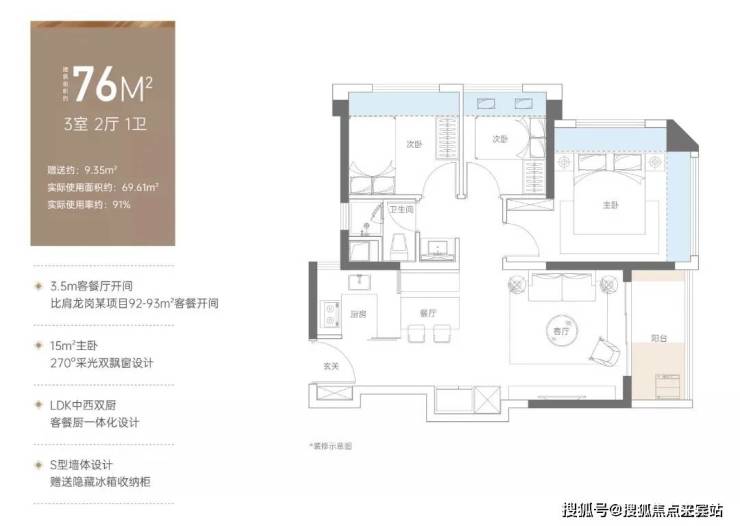 客餐厨加上阳台进深达9.85米,客厅开间约3.5米,整个空间通透宽敞,这个尺度和市面上建面90多㎡三房无异。